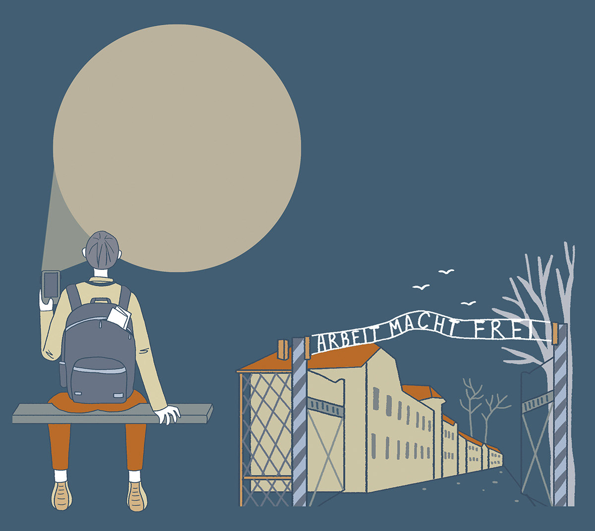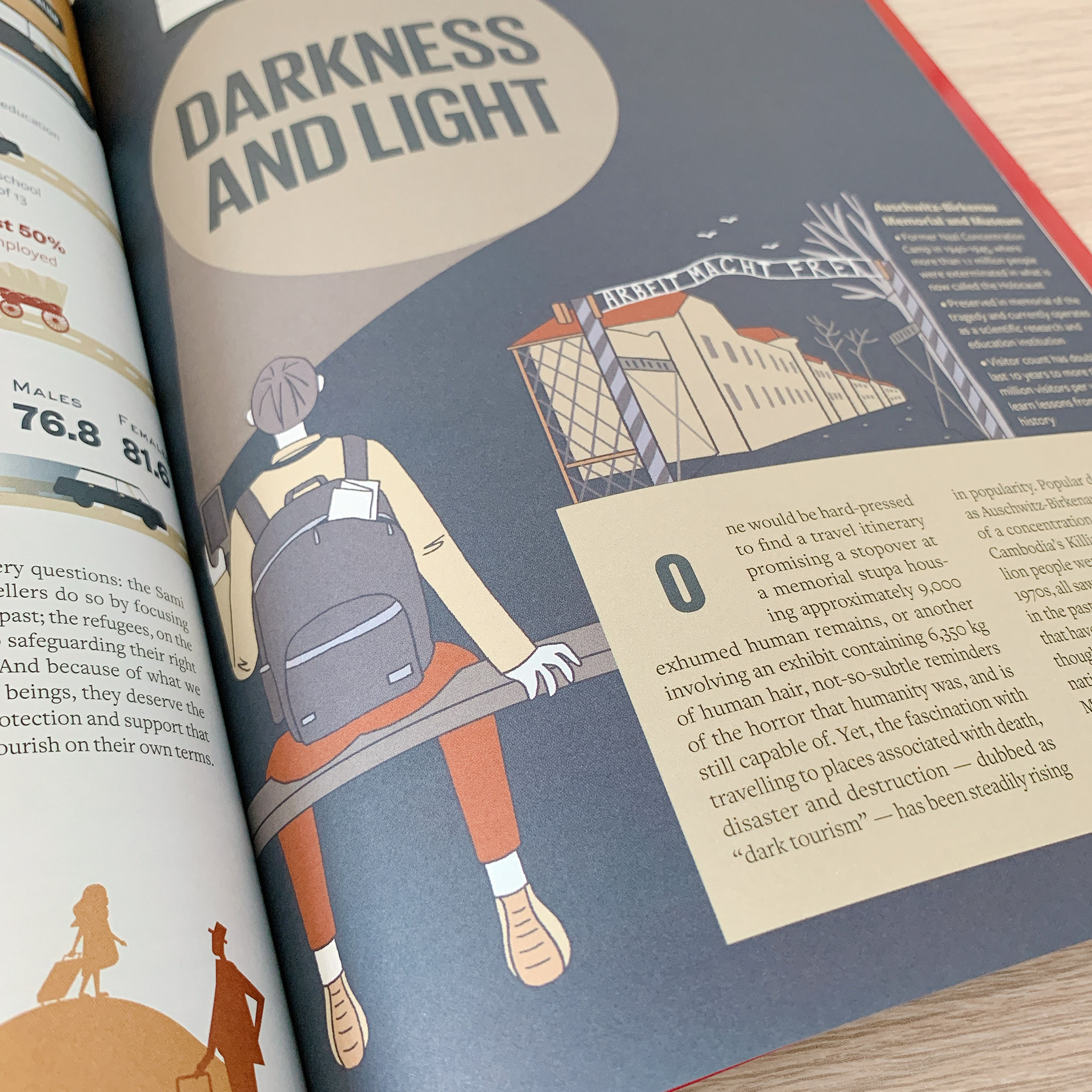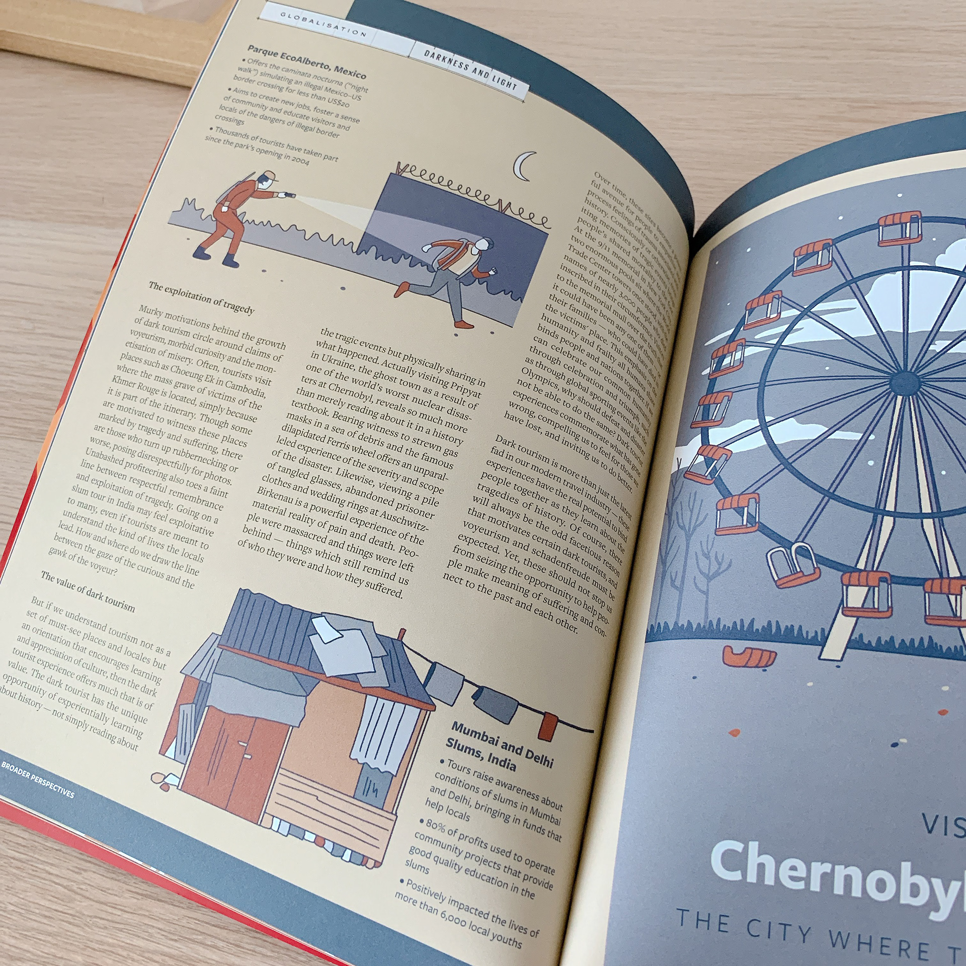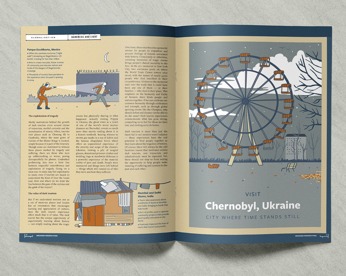 Editorial illustration and layout design for Broader Perspective magazine about dark tourism.